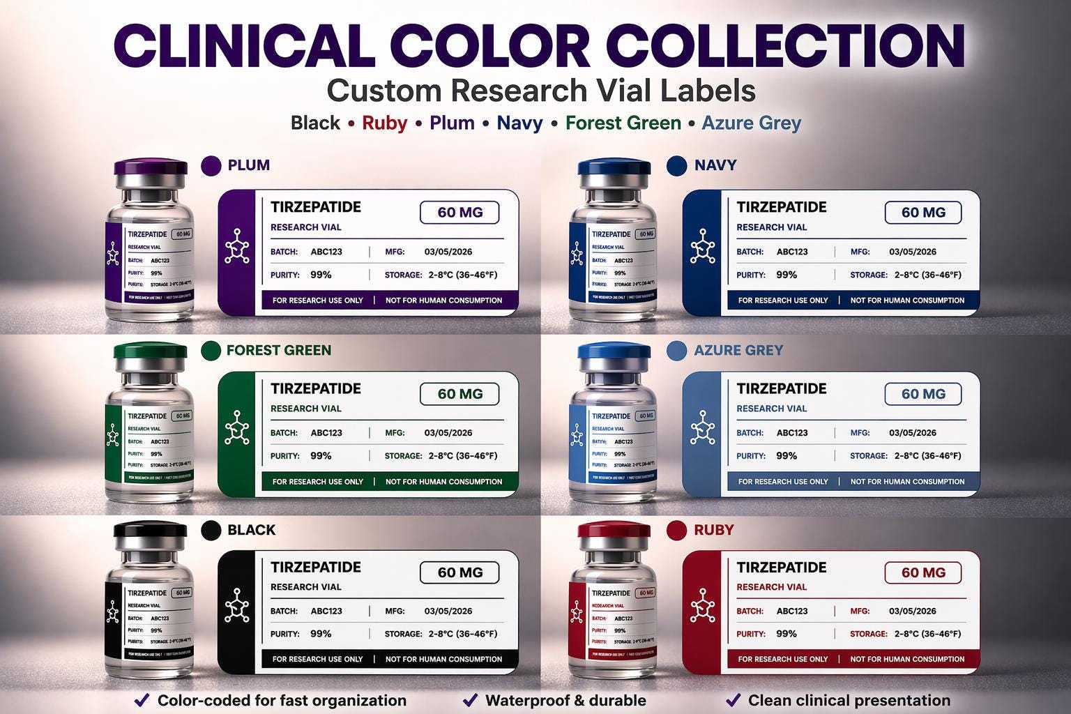 Custom clinical peptide vial labels designed for a clean, organized, professional look. These color-coded research vial stickers are sized for 3mL vials and printed on waterproof label stock for clear, durable labeling.